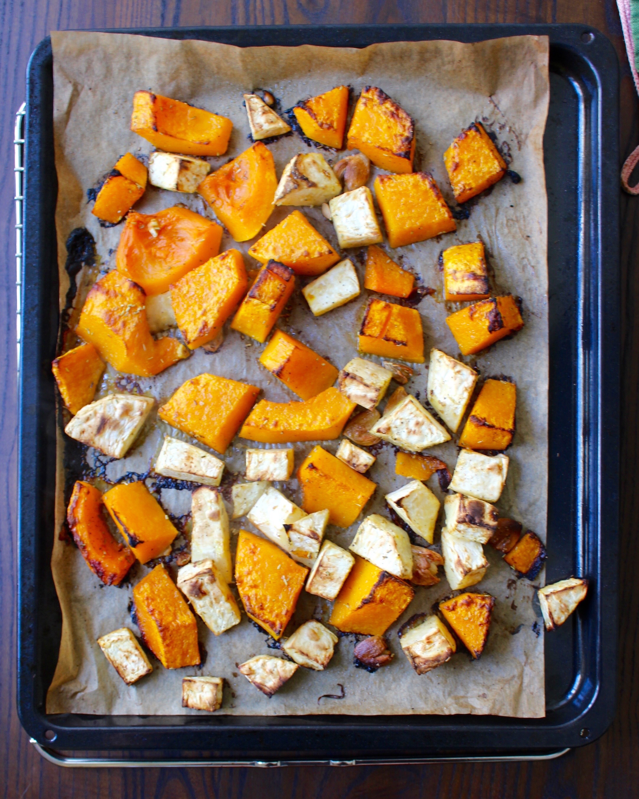 Sätt ugnen på 225°C. Skala, kärna ur och skär pumpan i tärningar/bitar, ca 2-4 x 2-4 cm. Gör samma med rotsellerin men dela i något mindre kuber. Hacka vitlöken grovt. Lägg pumpa, persiljerot och vitlök på en plåt med bakplåtspapper. Ringla över olja och krydda med örter, salt och peppar och vänd runt grönsakerna i kryddningen så att de täcks. Rosta mitt i ugnen ca 30 min. Alla grönsaker ska vara genombakade och få fin färg utan att brännas.