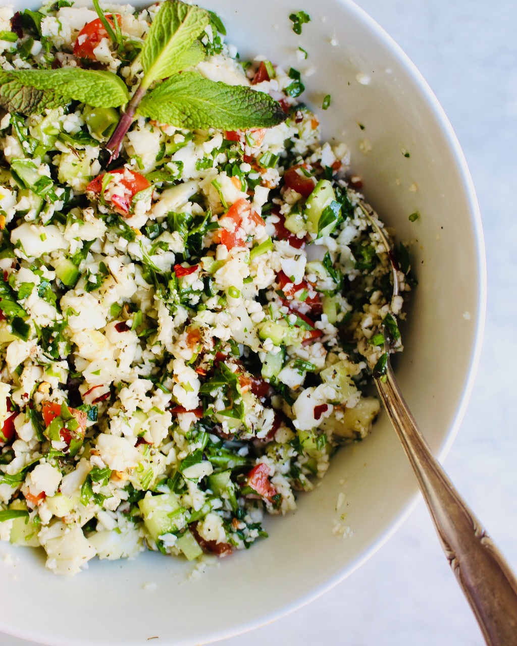 Tabbouleh gjord med blomkålsris istället för cous-cous. Smakerna i tabbouleh är ju så gott. Tidigare har jag lagt recept med quinoa istället för cous-cous. Blomkålstabouleh finns med i det här receptet med kryddig kyckling och tahinidressing.
