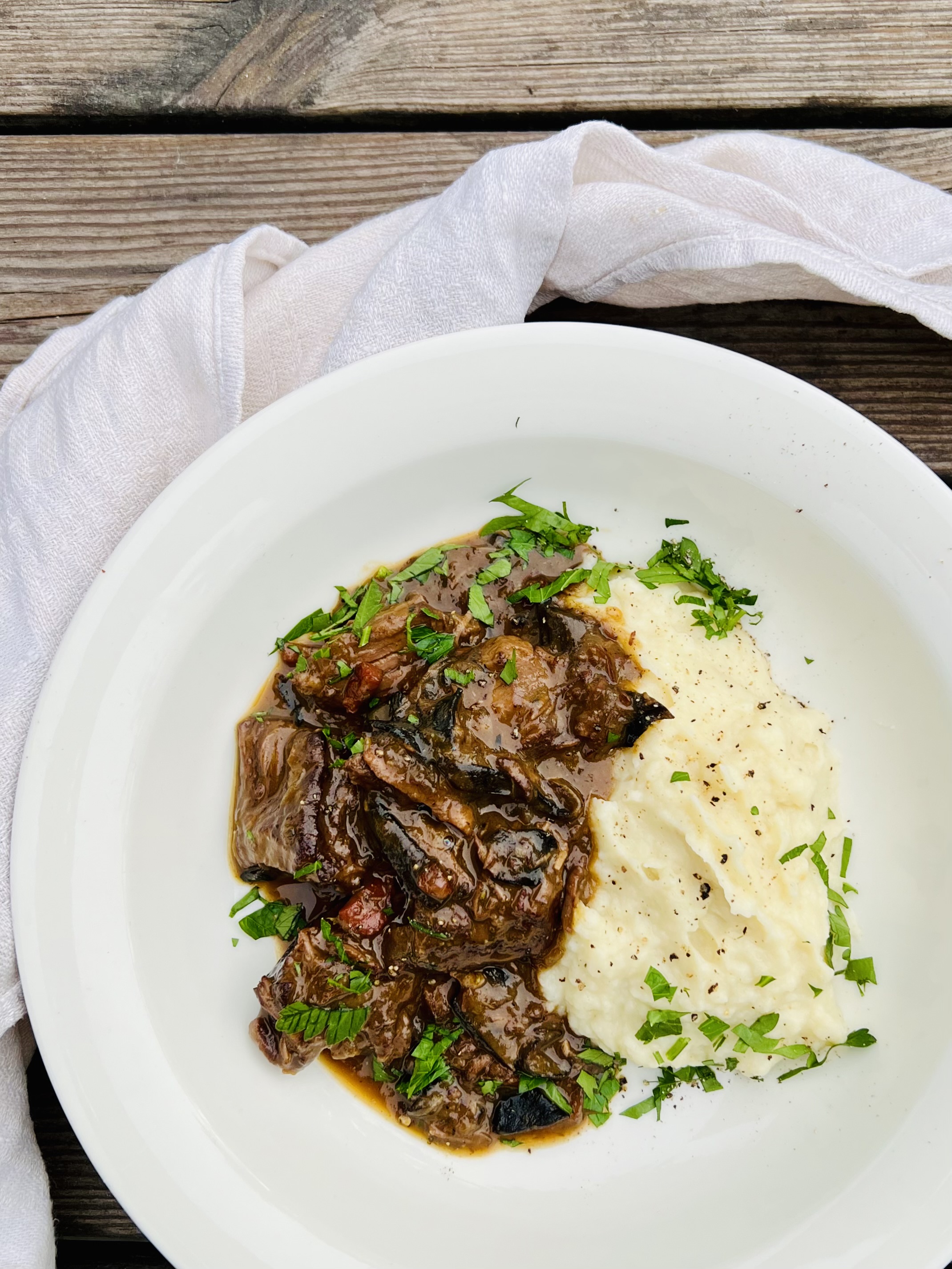 Högrevsgryta med svamp och rotselleri- och blomkålspuré