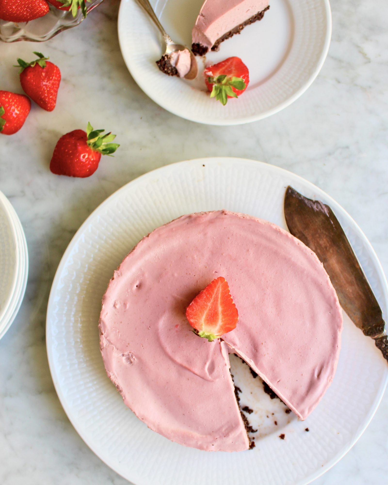 Somrig jordgubbstårta utan gluten, mjölk och vitt socker. En riktig publikfriare som passar de flesta i smaken, stora som små. Silkeslen gräddig fyllning som smakar massor av jordgubbar och om man vill lite lime eller vanilj som extra smakbrytning. Gör den här, snabbt och enkelt och njuuuuut av sommaren! <3